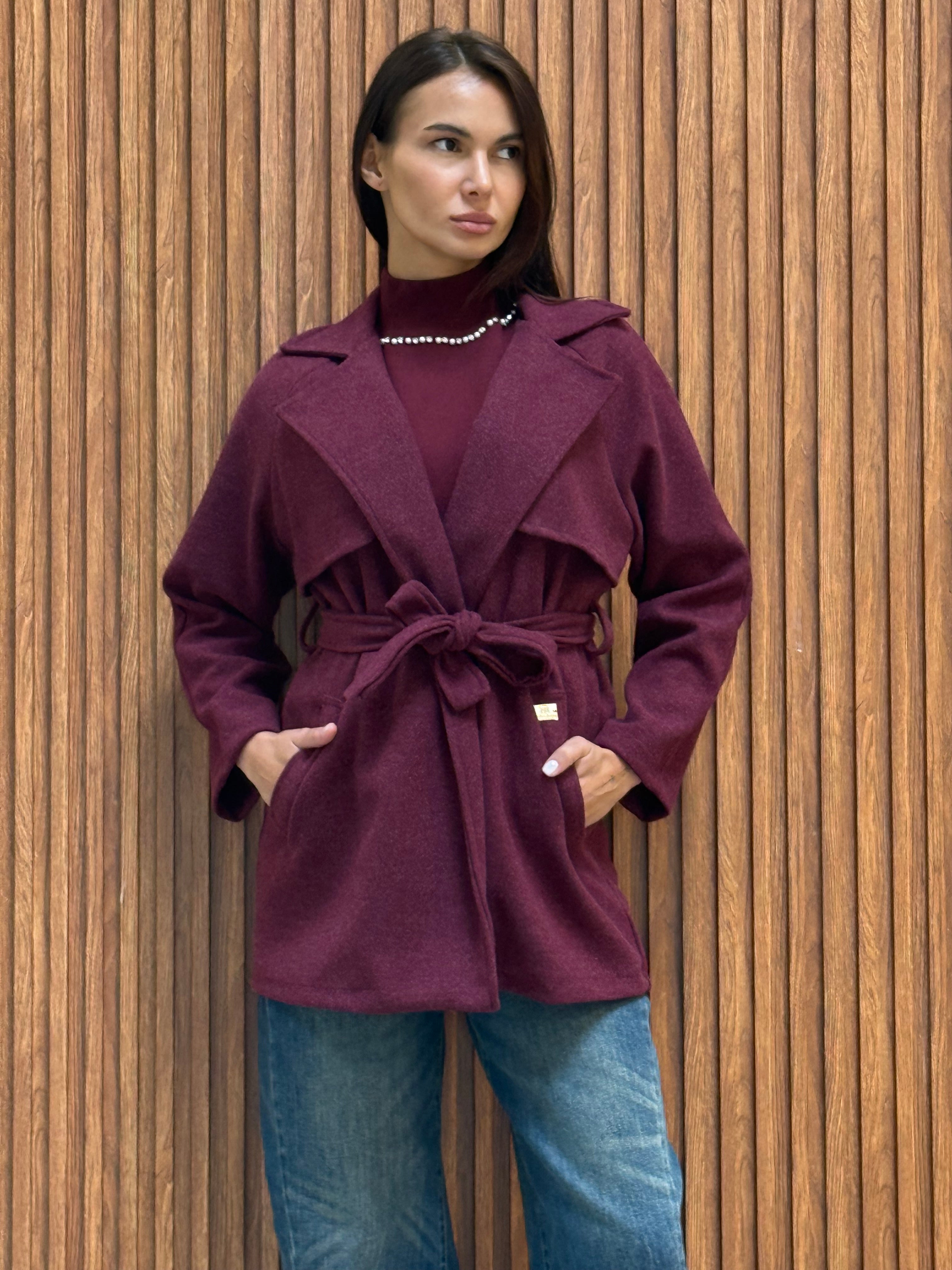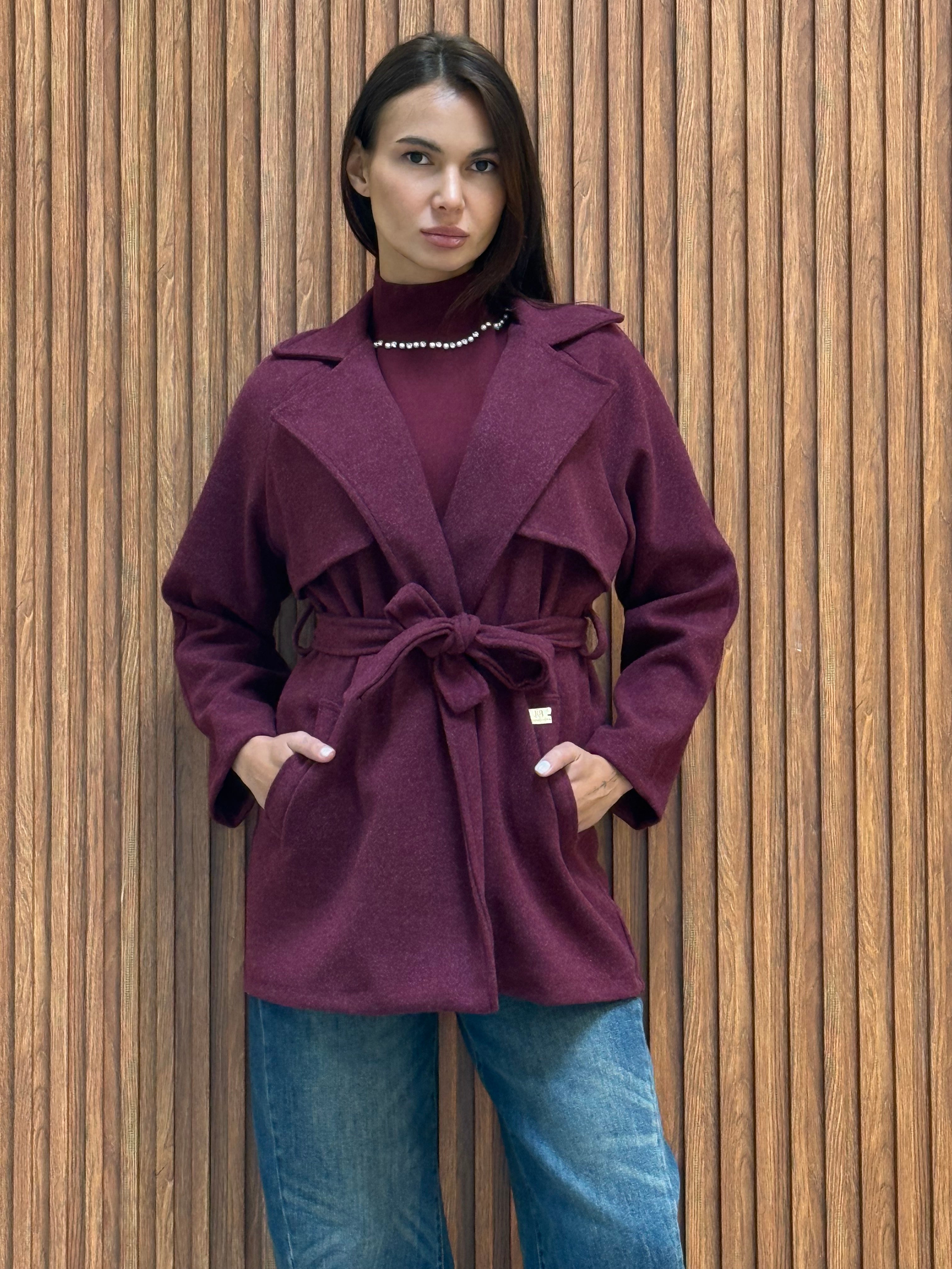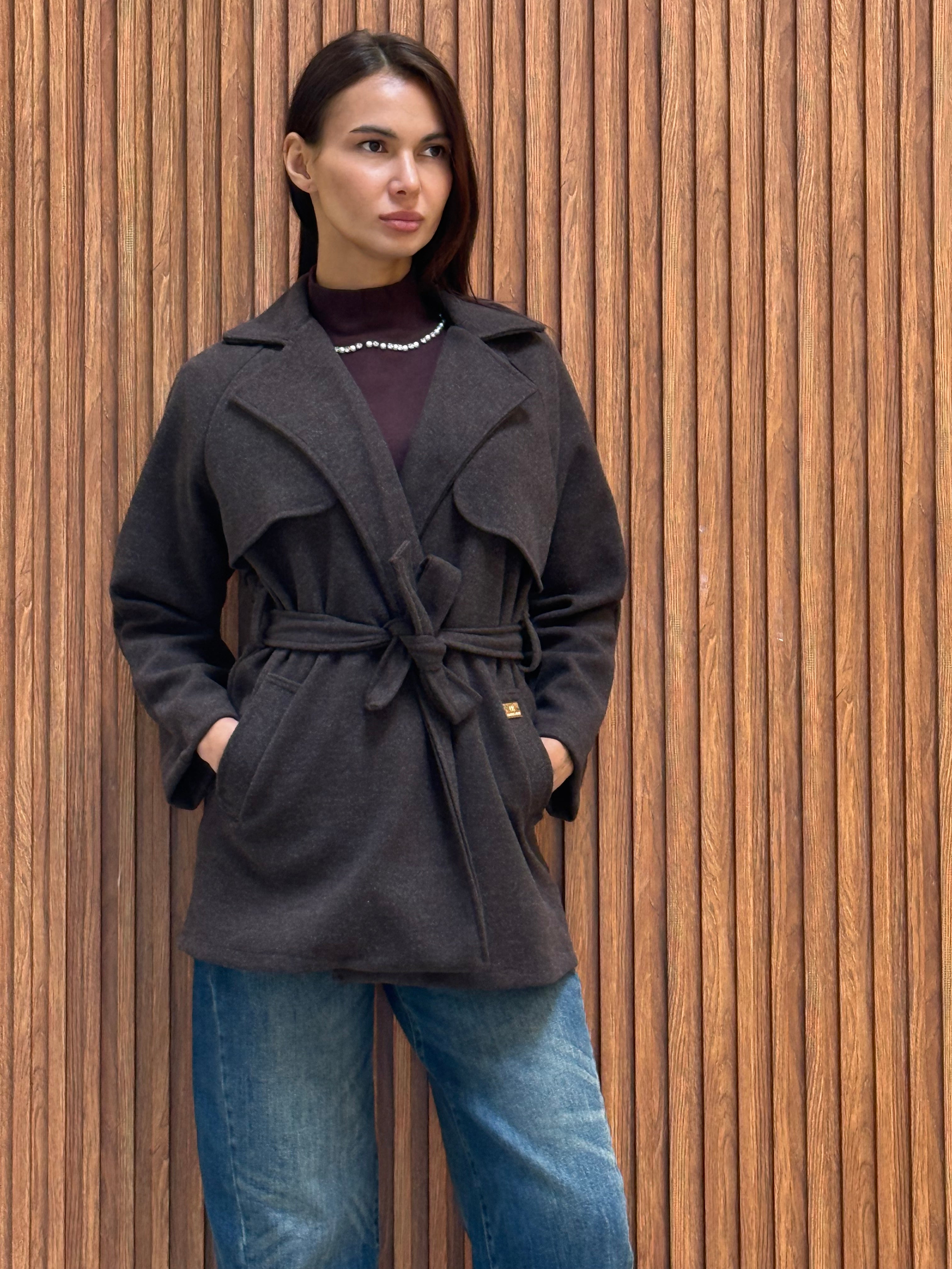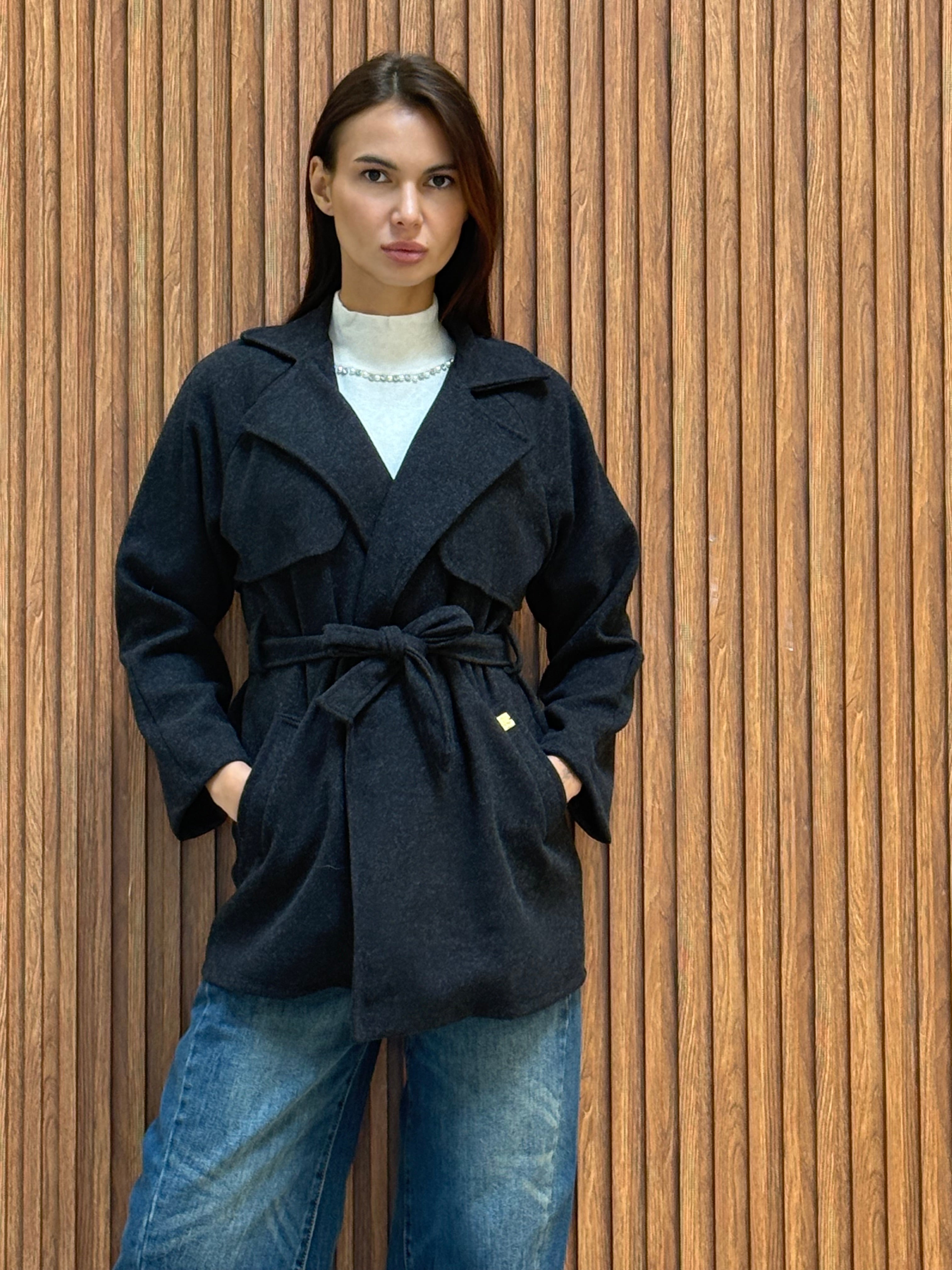 CAPPOTTO CORTO IN PANNO CON CINTURA IN VITA E PLACCA RB
