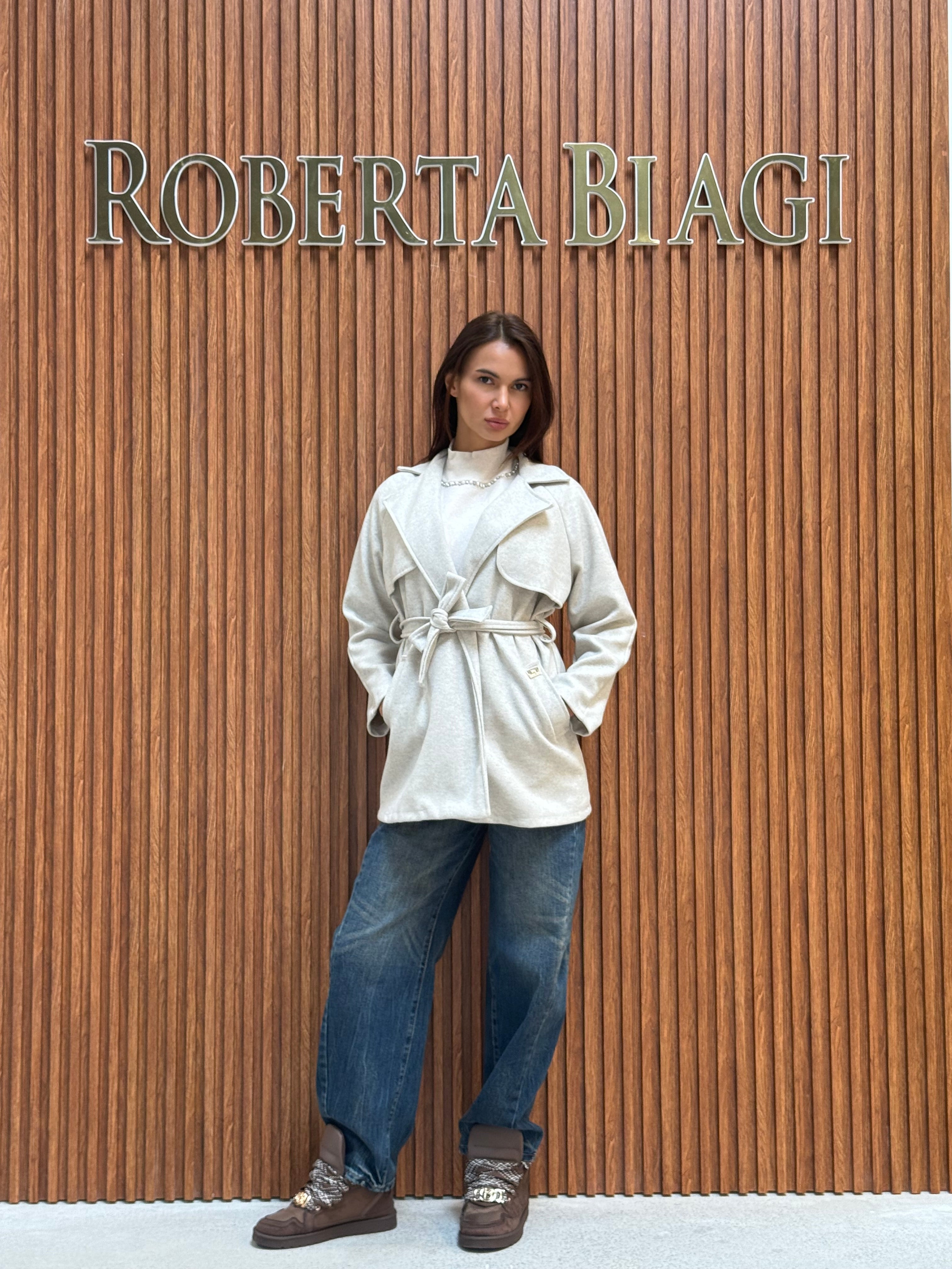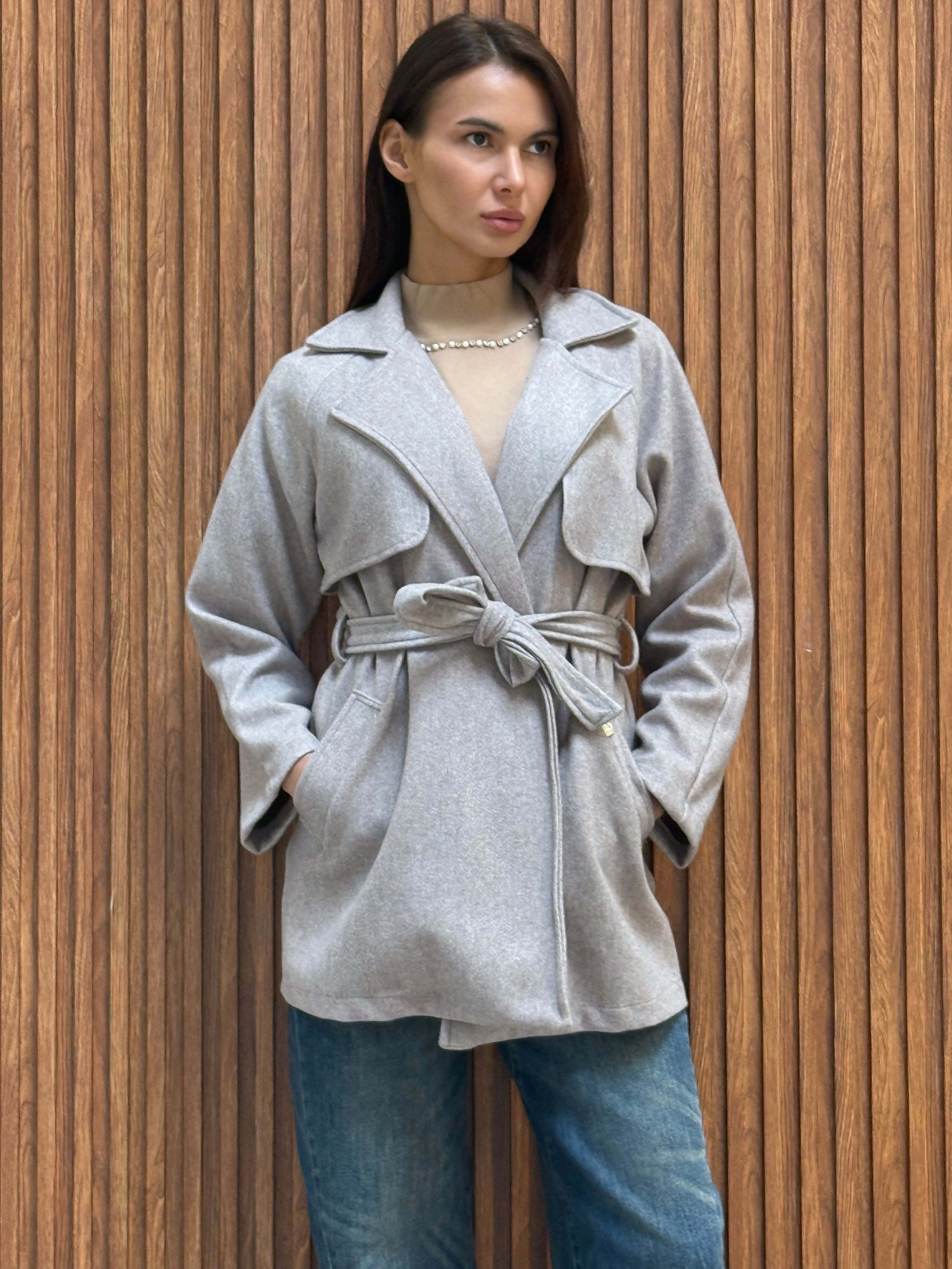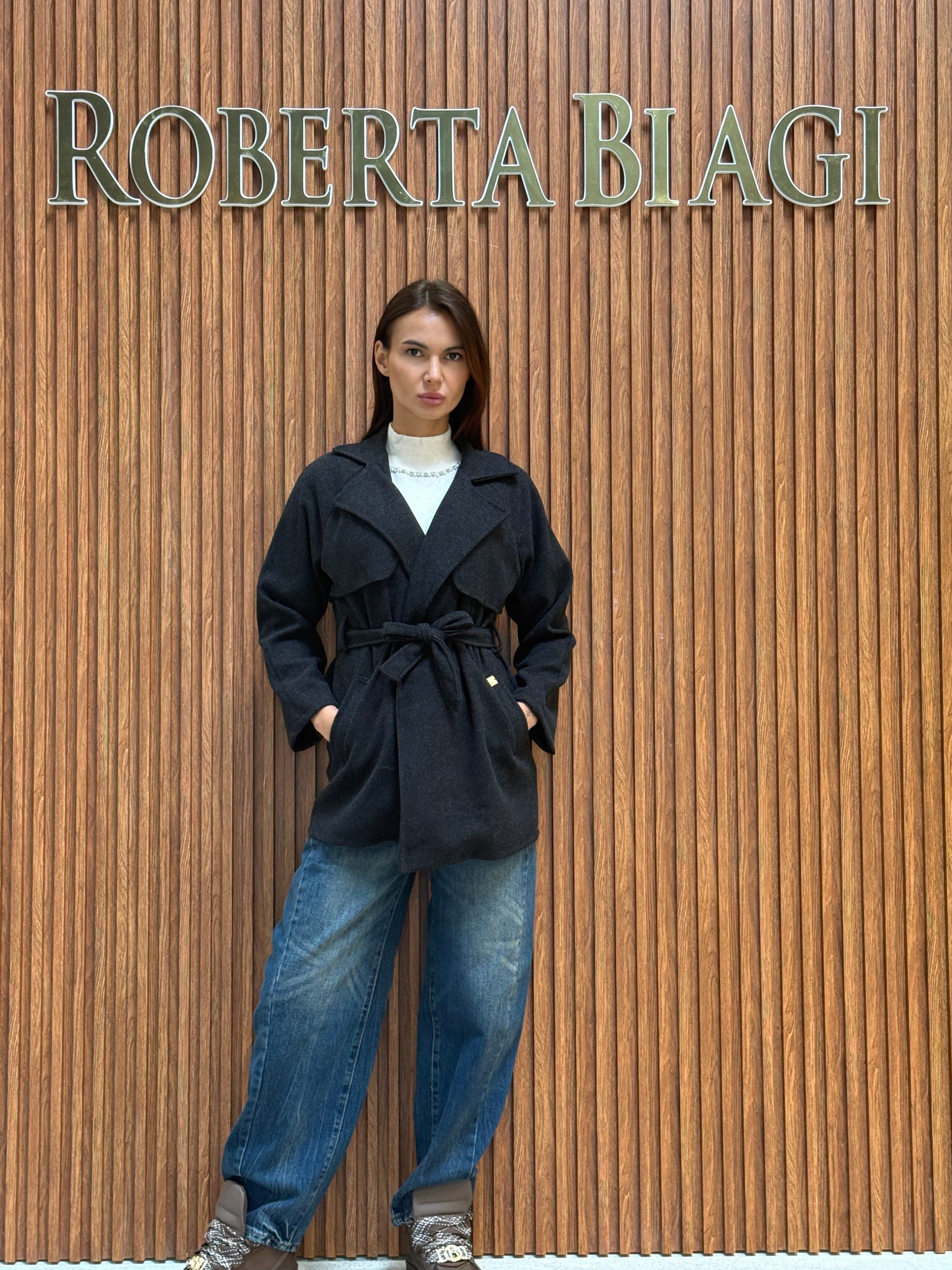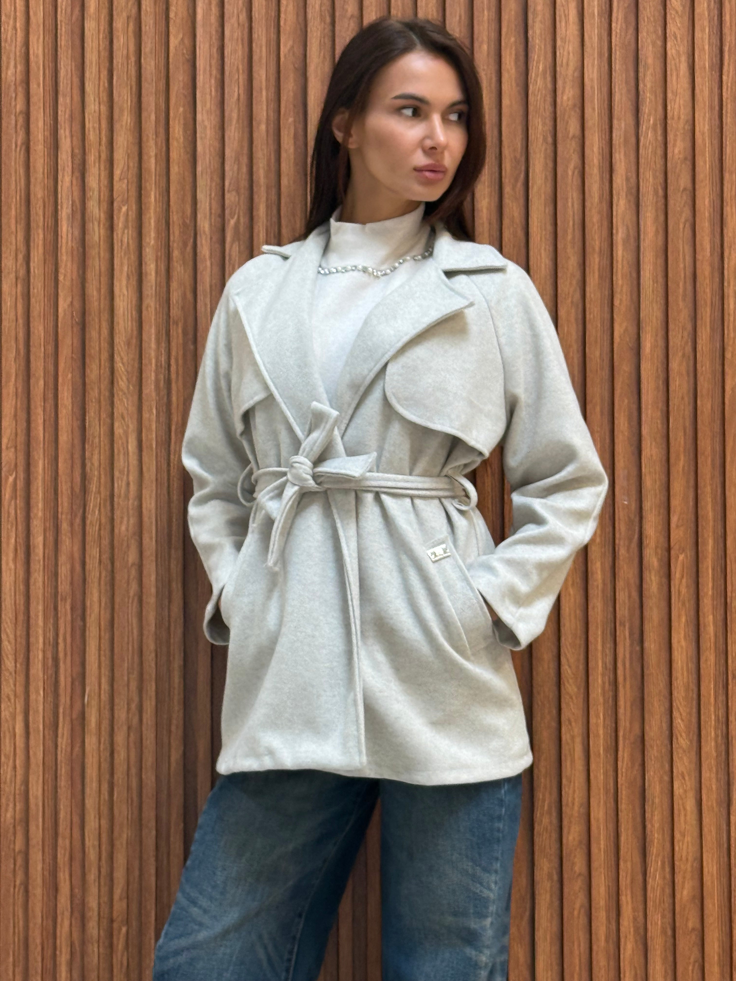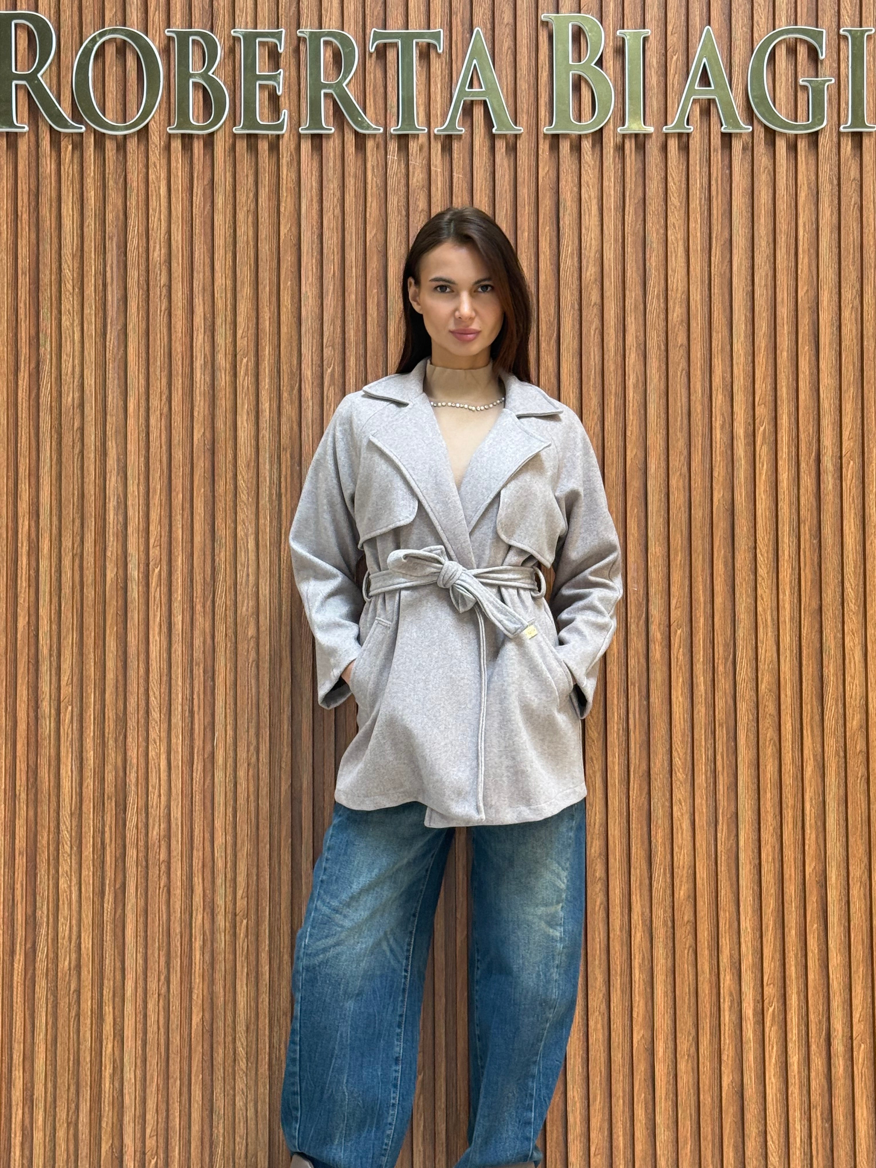 CAPPOTTO CORTO IN PANNO CON CINTURA IN VITA E PLACCA RB