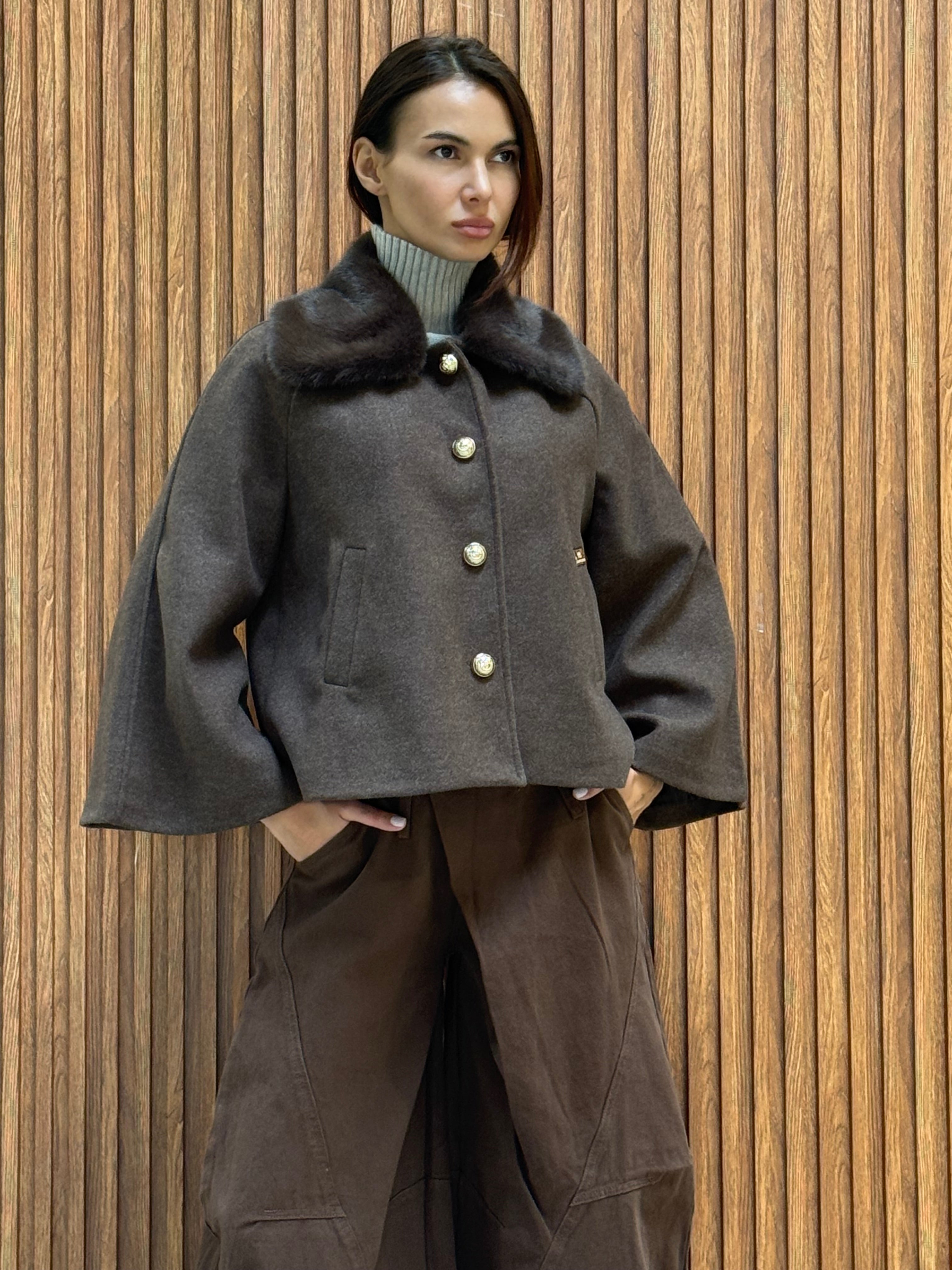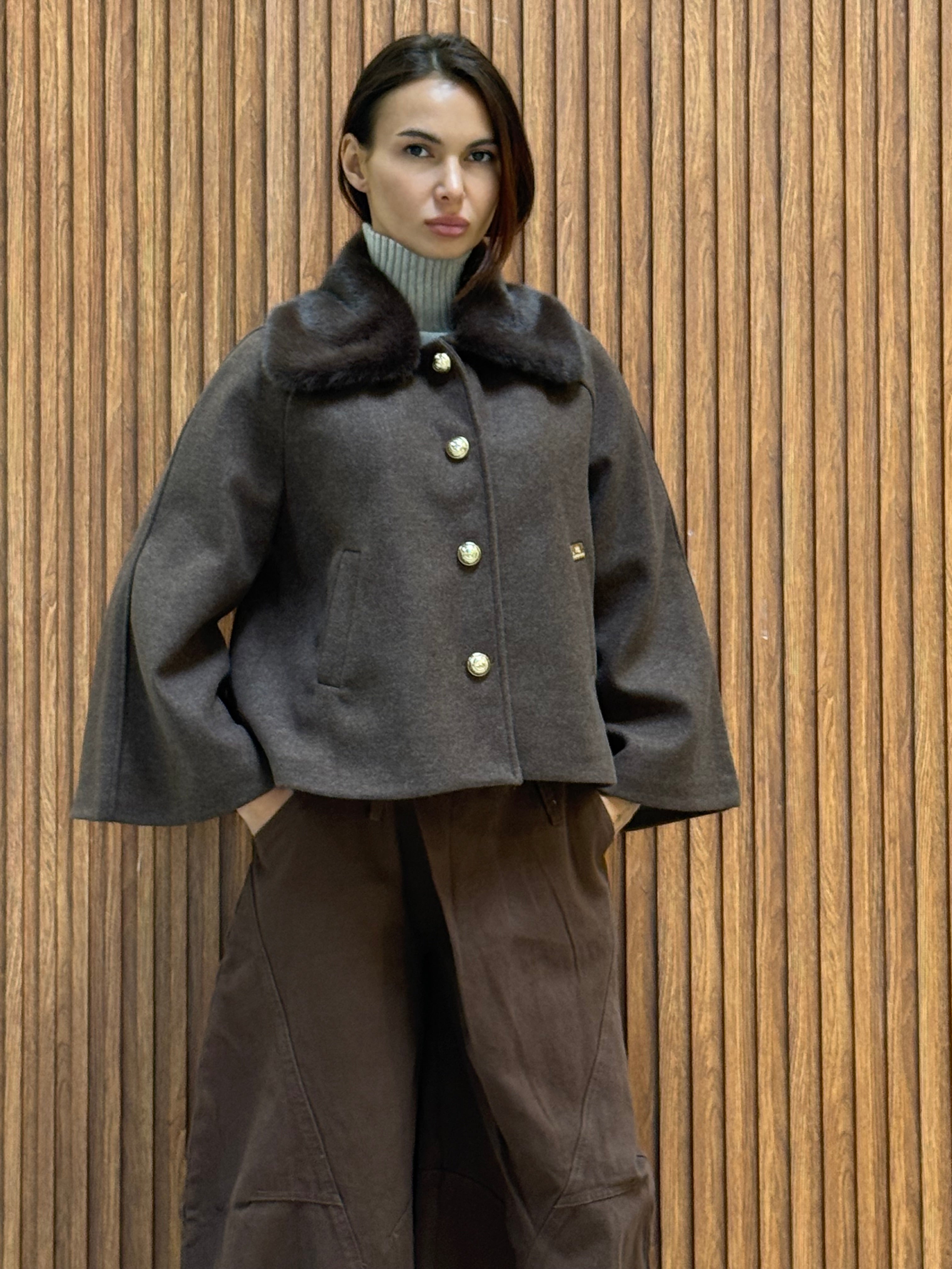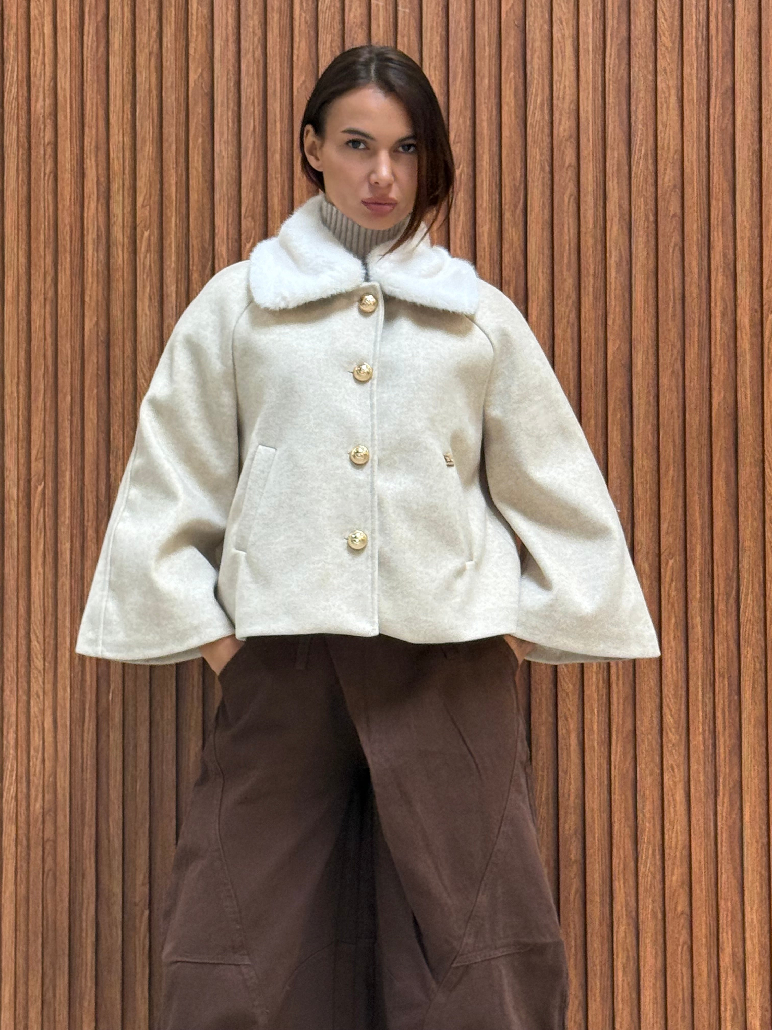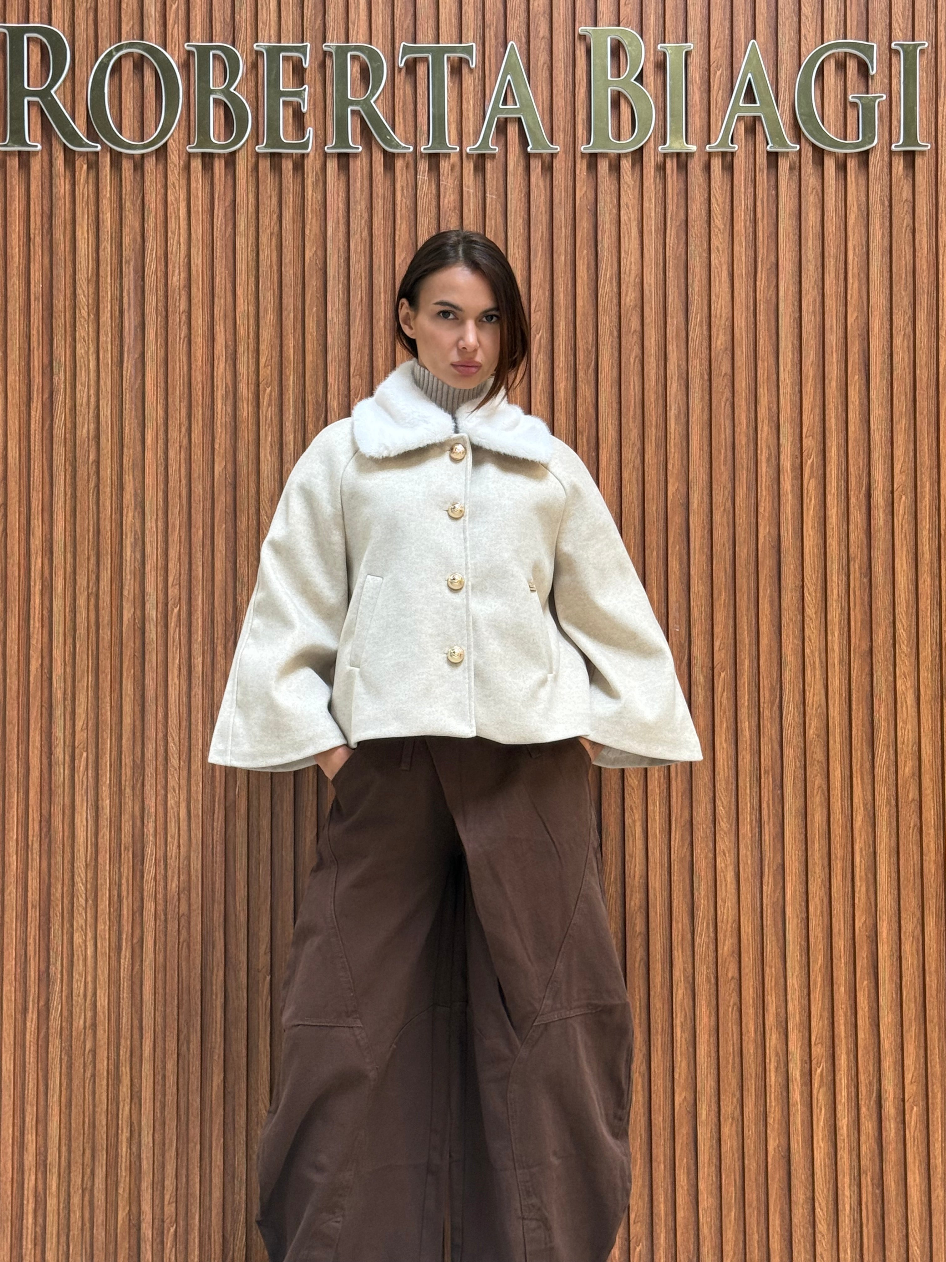 GIACCA CORTA CON COLLO IN ECOPELLICCIA BOTTONI ORO E DETTAGLIO RB
